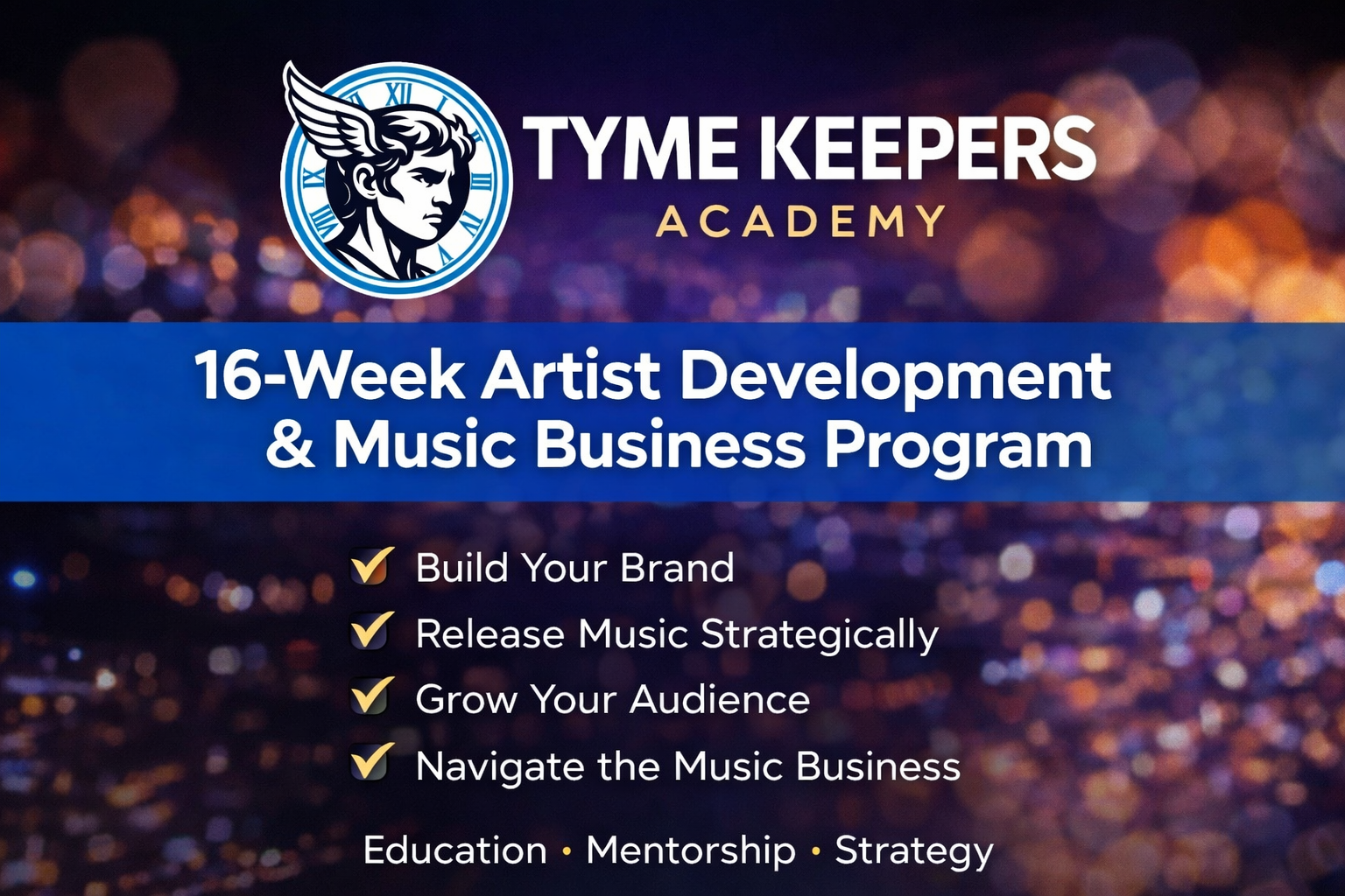 The TYME KEEPERS Academy is an artist development and music business training program dedicated to helping emerging creatives build sustainable, professional careers in the music industry. Combining education, mentorship, and real-world application, the Academy equips artists with the tools to strengthen their identity, develop their brand, understand industry fundamentals, and prepare for live performance and music releases. TYME KEEPERS Academy focuses on turning potential into progress — empowering artists to move with intention, confidence, and long-term career strategy.